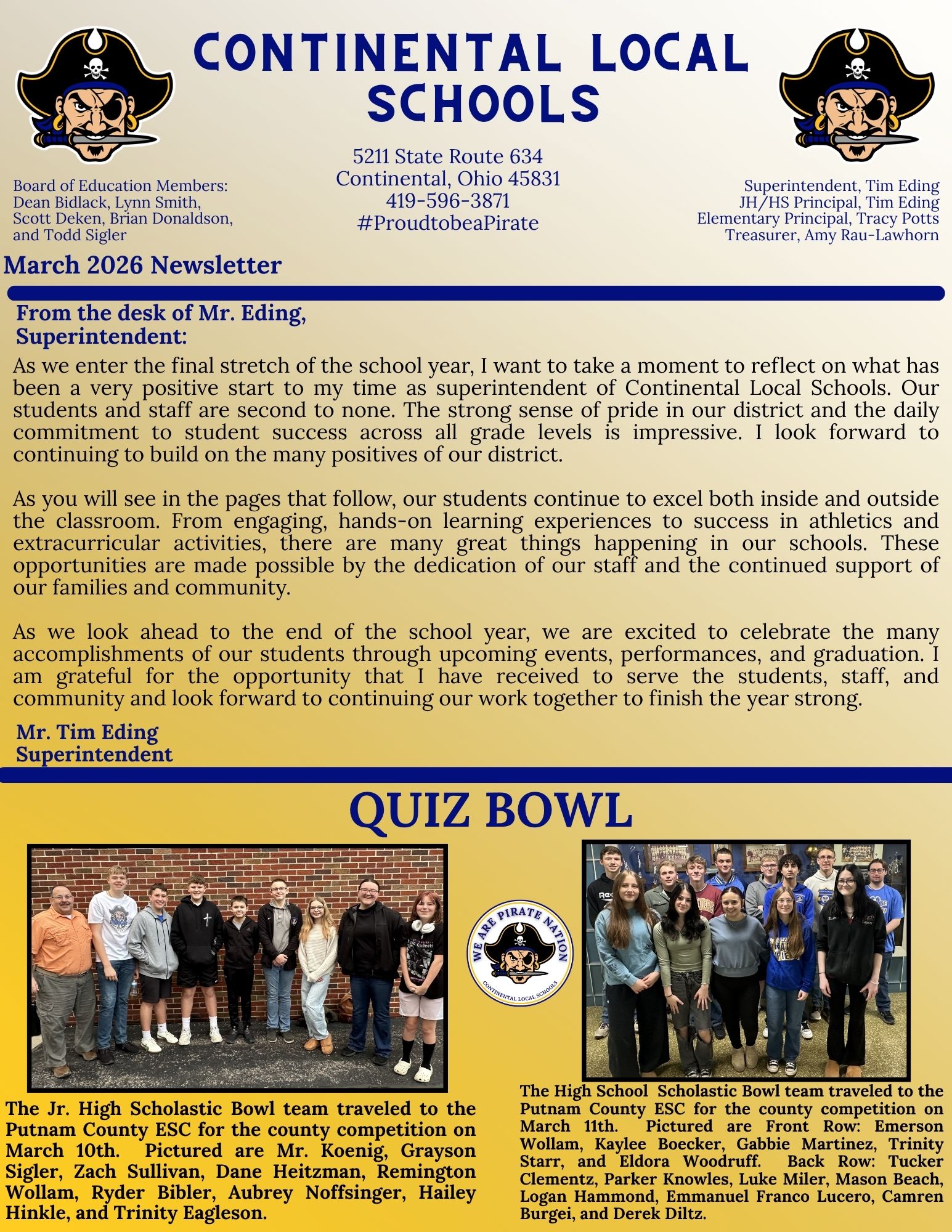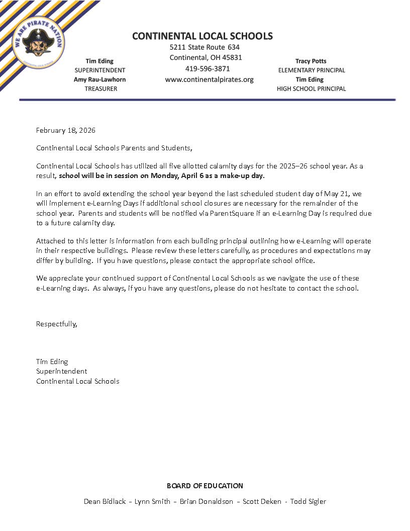 Continental Local Schools are committed to the fullest development of every student's unique talents and abilities. We strive to provide all students with a foundation for life-long learning. We encourage students, parents, and the community to join as partners in this commitment.
