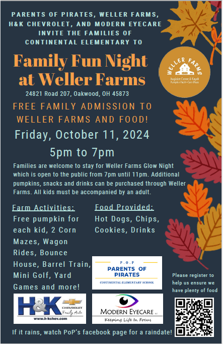 The Parents of Pirates with assistance from H & K, Modern EyeCare and Weller Farms are having a family fun night on Friday, October 11 at Weller Farms. Please see the flyer for more details. Please register for the event using this link: